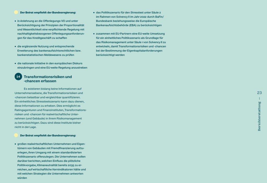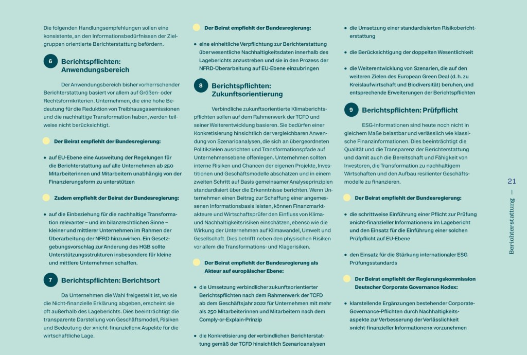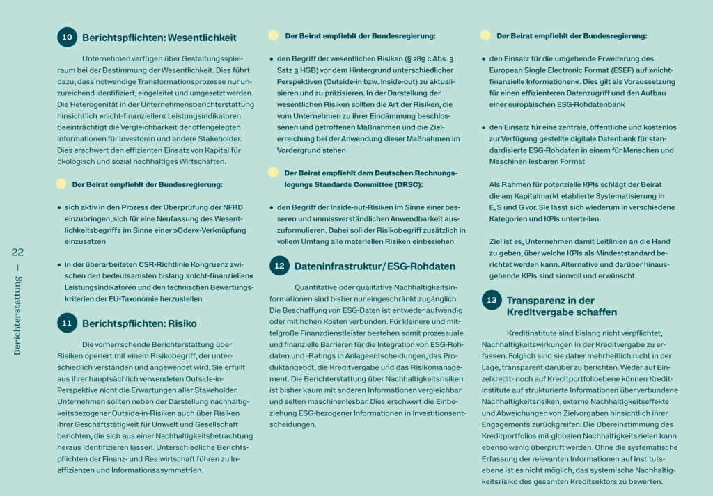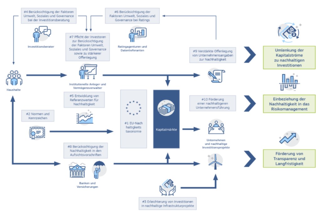 Das Ziel ist es, einen konsistenten und kohärenten Fluss von nachhaltigkeitsbezogenen Informationen durch die finanzielle Wertschöpfungskette zu schaffen. Um dies zu erreichen, wird die Konsistenz und der Abgleich zwischen den zukünftigen technischen Standards zu den Sustainable Finance Disclosure Regulation (SFDR) und möglichen Standards, die im Rahmen der NFRD entwickelt werden, besonders wichtig sein.