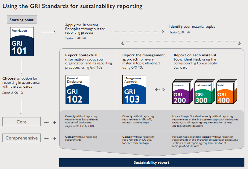 Die Erstellung eines Berichts in Übereinstimmung mit den GRI-Standards gibt aus Sicht der Vereinigung ein umfassendes Bild über die wesentlichen Themen eines/r Unternehmens/Organisation, die damit verbundenen Auswirkungen sowie darüber, wie diese gehandhabt werden. Darüber hinaus kann eine Organisation ausgewählte GRI-Standards vollständig oder teilweise verwenden, um spezifische Informationen anzugeben.