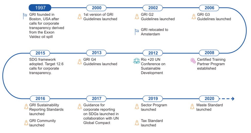 Die erste Version des damaligen GRI-Leitfadens (G1), der im Jahr 2000 veröffentlicht wurde, stellet den ersten globalen Rahmen für die Nachhaltigkeitsberichterstattung dar. Im folgenden Jahr wurde die GRI als unabhängige, gemeinnützige Institution gegründet. Im Jahr 2002 zog die GRI nach Amsterdam, Niederlande, um, und die erste Aktualisierung der Richtlinien (G2) wurde veröffentlicht. Da die Nachfrage nach GRI-Berichterstattung und die Akzeptanz von Organisationen stetig zunahm, wurden die Richtlinien erweitert und verbessert, was zu G3 (2006) und G4 (2013) führte.
