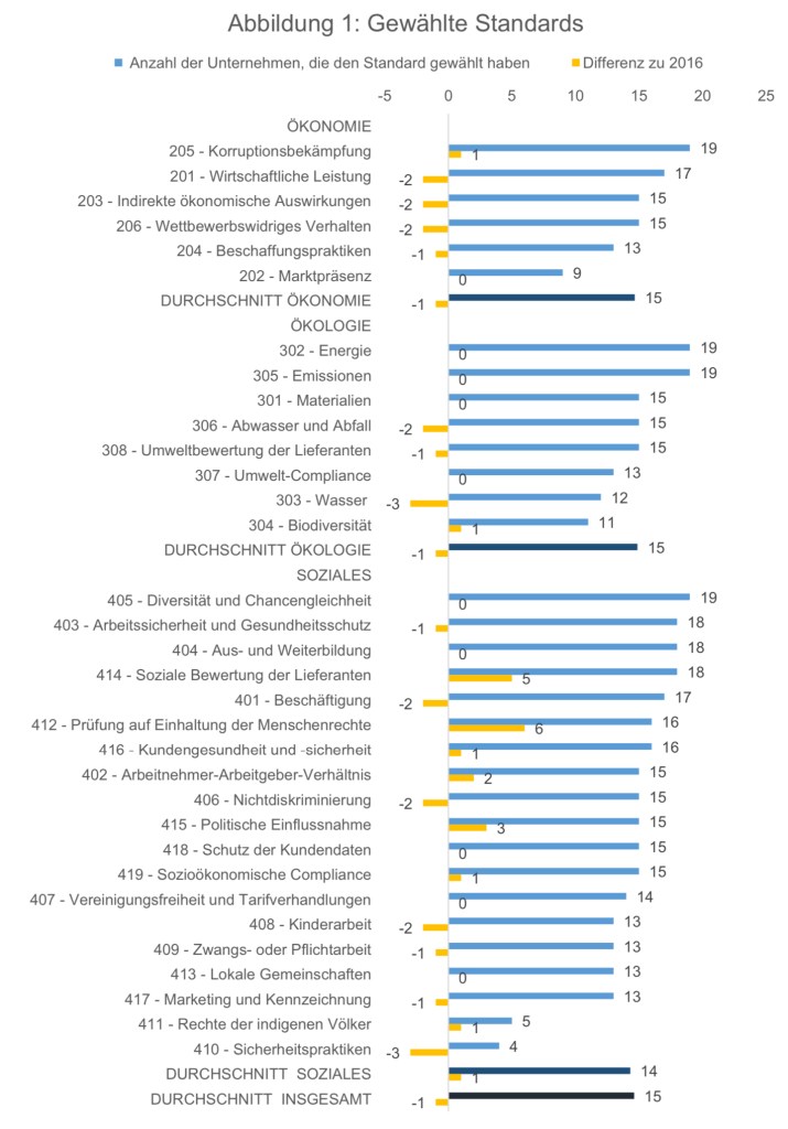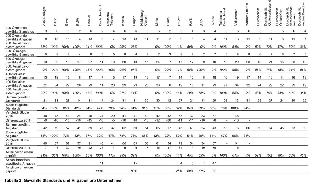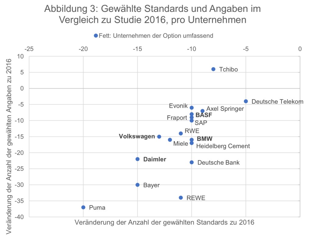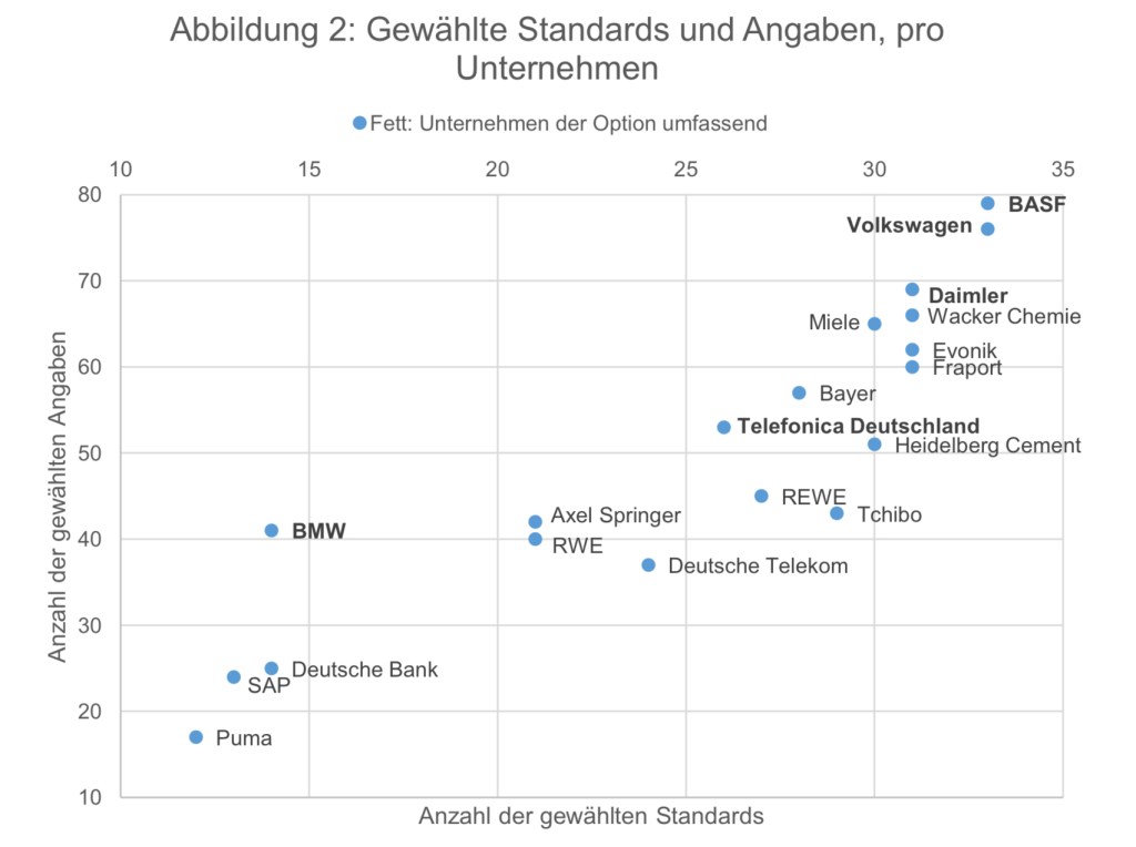 Transparency International kommt in der Studie 2020 zu den Ergebnis, das in Deutschland nur fünf von 19 Unternehmen die Option umfassend wählten. In der Studie 2016 hatten noch 7 Unternehmen die Option umfassend gewählt. Inzwischen berichtet Siemens nicht mehr in Übereinstimmung mit den GRI-Standards, sondern orientiert sich nur noch daran – und wurde deshalb aus der Stichprobe herausgenommen. Bayer und REWE sind von der Option umfassend zur Option Kern gewechselt. Mit der Option umfassend verblieben also in der Stichprobe BASF, BMW, Daimler und Volkswagen – alles große Unternehmen der verarbeitenden Industrie. Hinzugekommen ist Telefónica Deutschland.