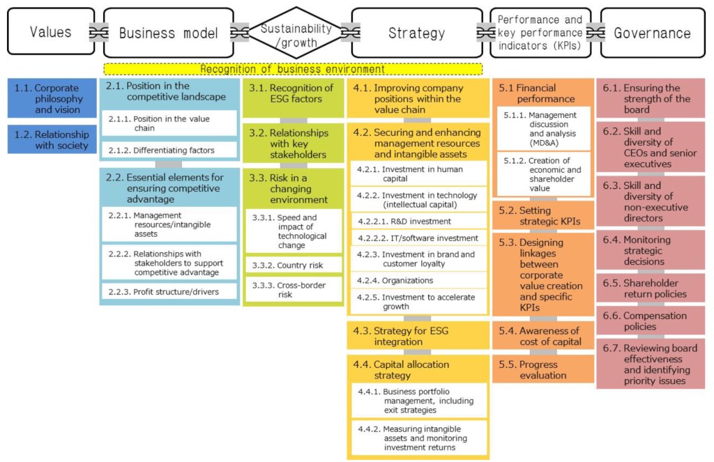 Nachstehendes Schaubild stellt im Kern die konzeptionelle Sichtweise der Arbeitsgruppe und somit auch die offizielle Empfehlung des METI dar. Aus der Darstellung lässt sich ein entsprechendes methodischen Vorgehen für Unternehmen zur Integration von ESG-Aspekten strukturiert ableiten.